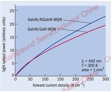 功率下降具体来说是指蓝光、绿光和在电流增大时效率反而下降的现象。GaN基LED通常仅在电流密度10A cm-2时效率达到峰值,电流密度为100A cm-2时效率降为峰值的一半。这引起了大家的关注,当今的高亮度芯片都需要在比10A cm-2大得多的电流密度下高效地工作。