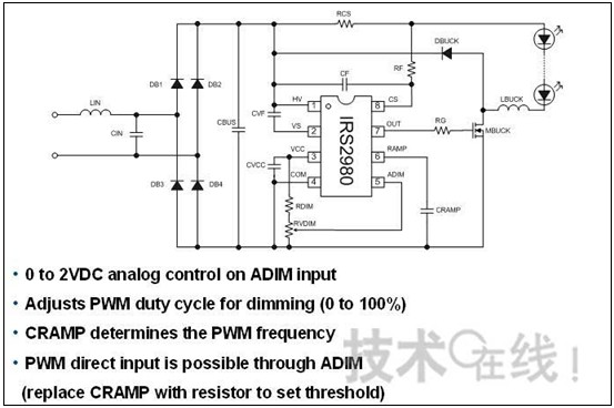 基于IRS2980的低本钱LED驱动器应用及参考设计的PWM调光选项分别如图25和图26所示。