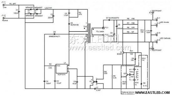 安森美半导体的NCP1014LEDGTGEVB评估板经过了优化,可以驱动1到8颗大功率高亮度LED,如Cree XLAMP® XR−E/XP−E、Luxeon™ Rebel、Seoul Semiconductor Z−POWER®或OSRAM Golden Dragon™。这设计基于集成了带内部限流功效的高压电源开关的紧凑型固定频率脉宽调制(PWM)转换器NCP1014构建。由于NCP1014采用固定频率工作,电流不能上升到高于某个特定点;这个点由输进电压及开关周期或导通时间结束前的低级电感来断定。由于导通时间的限制,输进电流将追随输进电压的波形,从而供给更高的功率因数。相干电路图见图2。